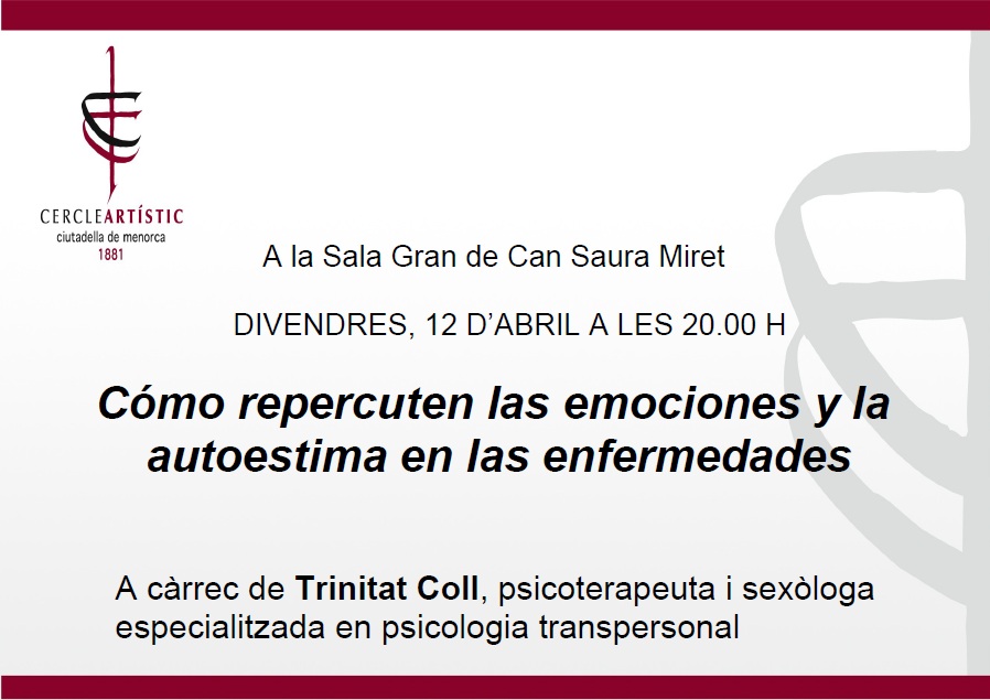 Benvolguts/des, Us informam de la propera conferència que organitza el Cercle Artístic de Ciutadella: Cómo repercuten las emociones y la autoestima en las enfermedades, a càrrec de Trinitat Coll, psicoterapeuta i sexòloga, especialitzada en psicologia transpersonal. L'acte serà el proper divendres, 12 d'abril a les 20.00 hores, a la Sala Gran de Can Saura Miret. Confiam que sigui del vostre interès.